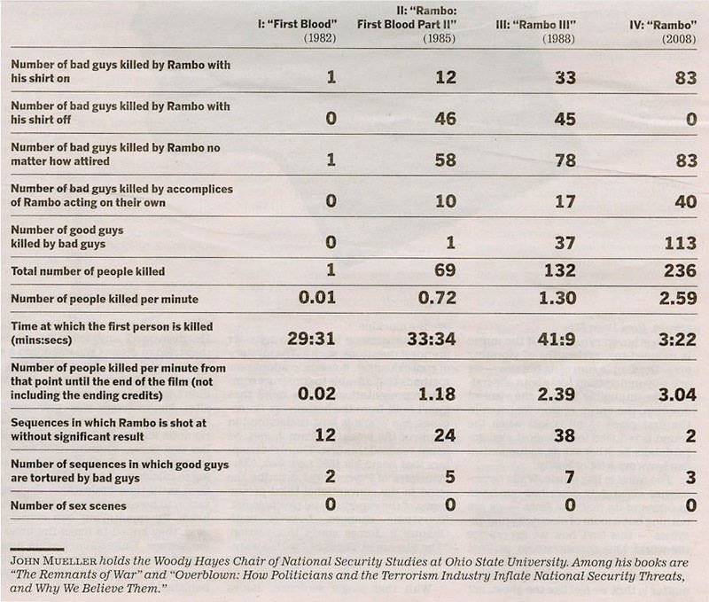 WHAT ELSE is Rambo known for than the waste he laid to others, can you tell me? That’s his thing — KILLING!!! He’s a killing machine. He knows it, you should too. Just look at the Rambo Death Chart compiled by the LA Times (see chart here just below at right; click for larger view).