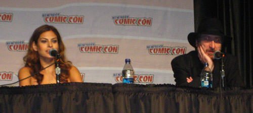 Mendes talked a little about her role as the sexy jewel thief Sand Saref who’s been married 15 times and has killed every one of her husbands. Check out the image of Mendes and Miller at the New York Comic Con panel here below.