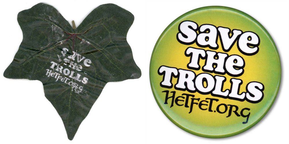 As I sat in the NY Comic Con press room on Saturday, typing away on one of my numerous NYCC stories, I noticed an unusual item buried beneath a wade of promo paper right next to my laptop. It looked like a green leaf sticking out from the pile, though how and why a leaf would be there, I did not know. So I dug it out and upon inspection saw that it had a message on it — SAVE THE TROLLS — and a URL. A pin nearby pin contained the same message and Web site on it.