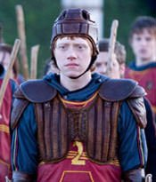 The first image is of Harry Potter’s best mate Ronald Weasley (Rupert Grint) on the field attired in a Quidditch uniform. (Ron actually joined the Gryffindor Quidditch team in book 5 — Harry Potter and the Order of the Phoenix — but that storyline was cut from the film adaptation). The second image is again of Ron in uniform, this time sitting with Hermione (Emma Watson) and his Quidditch teammates in the dining hall. The final photo is of the new Potions teacher, Professor Slughorn, (played by new cast member Jim Broadbent) standing in what appears to be his office with Harry (Daniel Radcliffe) standing in the background.