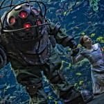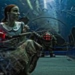 Until we finally get to see what amazing or abominable paths they take with that live-action movie, we could once only imagine what a living and breathing Rapture might look like. Well, thankfully there’s some pretty talented artists out there on our planet and one of them, named Harrison Krix, has done a damn fine job in helping to show us this real BioShock. Krix and his Volpin Props (Head here to see a bunch of amazingly detailed props) created a fantastic replication of a Big Daddy, added a Little Sister, and brought them to Dragon*Con. While that was all well and fun, it wasn’t enough, and they went ahead and set up an arrangement to shoot some photographs with Dim Horizons at the Georgia Aquarium. Once they were finally able to get in for the shoot, the result was a very cool set of images of the Big Daddy and Little Sister in a tunnel surrounded by water and ocean life resembling the dark world of Rapture.