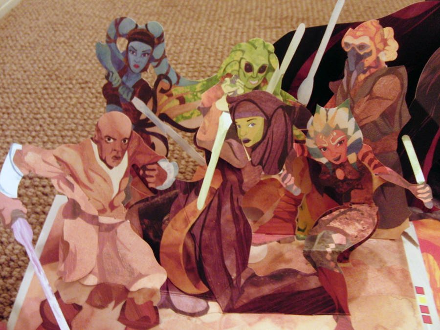 Maybe picking a whole page is a cop-out, but you can’t choose just one from here. Upon opening the last page you are besieged with holy awesomeness as Anakin transitions into a giant Darth Vader pop with a lightsaber that symbolically goes from blue to red. The light-up lightsaber is the crown jewel of this book that’s certain to send prospective buyers scurrying to bookstore to make the purchase. And this isn’t even the coolest pop-up on the page! That award goes to the unexpectedly large Jedi Warriors of Light pop. As amazing as Darth is, you know it’s coming””it’s only advertised everywhere you see this book. The Jedi Warrior pop seemingly comes from nowhere, buried beneath the Jedi Council pop. It gave me a nerdgasm, the hallmark reaction of all Star Wars schwag worth some hard-earned coin. For the record, I thought that the bad ass double-pop illustrating Obi-Wan and Anakin’s epic showdown in Episode 3 was nearly as cool. Not to mention the other surprises waiting to be uncovered on this page.