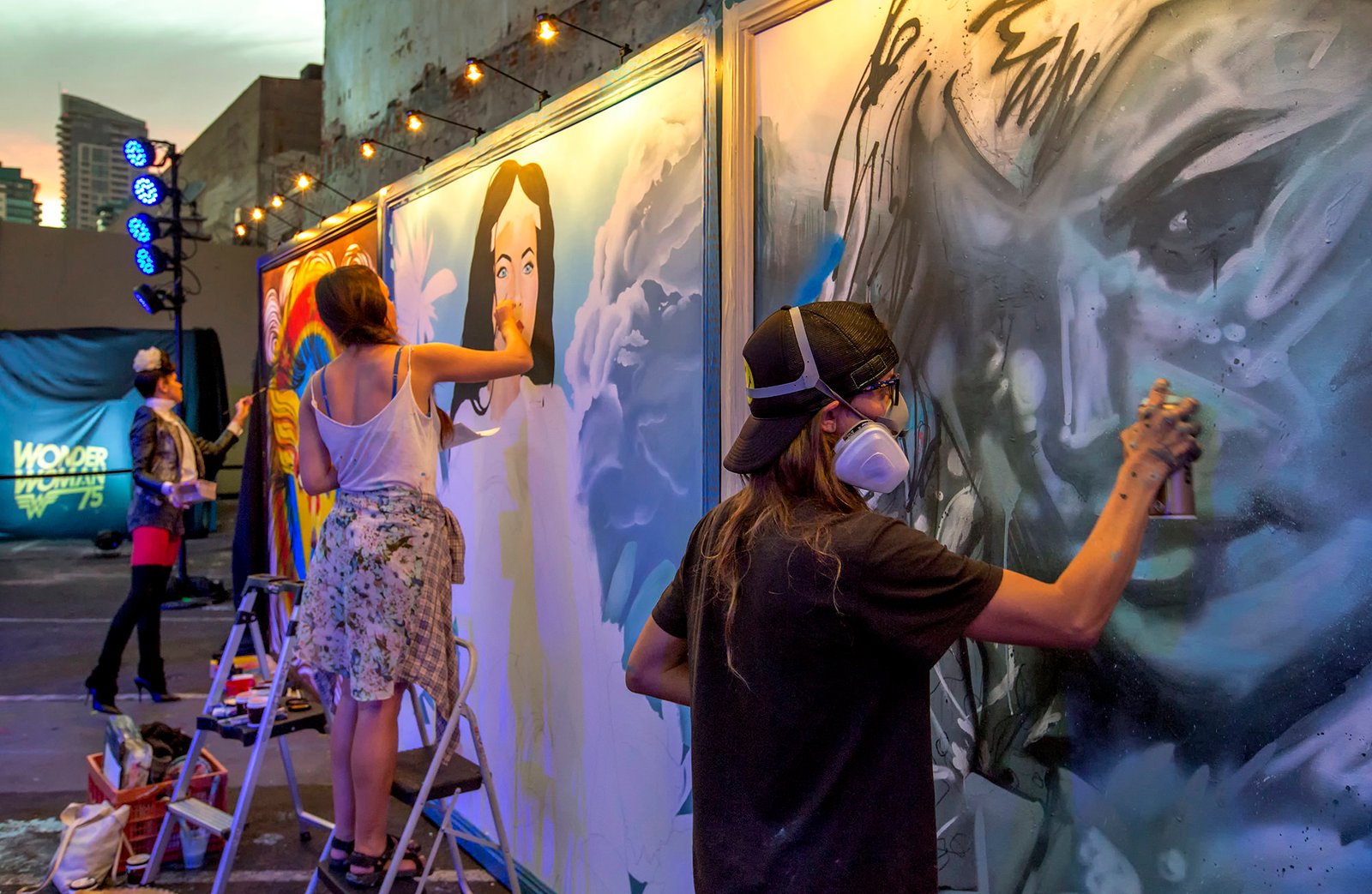 Christina Angelina , Celeste Byers and Katherine Bannock paint their Wonder Woman-inspired art at Warner Brothers Consumer Products Preview Event at Comic Con International on Wednesday, July 20, 2016, in San Diego. (Photo by Christy Radecic/Invision for Warner Bros. Consumer Products/AP Images)